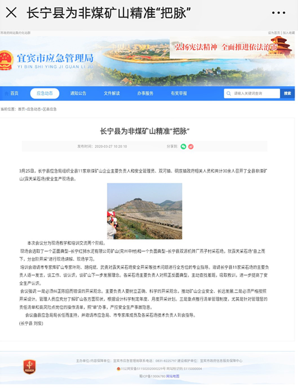 3月27日,宜賓市應急管理局報道了此次會議。此次會議中市縣領導高度評價了兗州中材長寧分公司的礦山開采工作,同時被市縣領導評為正面典型我司感到很榮幸。在此后的工作中我們要更努力,爭取更大的進步,樹立好我們的企業形象。