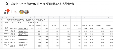 分公司建立多種檢查制度,通過現場人員現場檢查、在項目隔離人員與未返工員工自查等多種形式進行人員健康狀況監測,并如實記錄,如有異常者及時送醫就診,做到“早發現,早隔離,早上報,早治療”,切斷傳播途徑,杜絕疫情蔓延。
