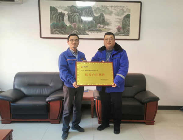 11月25日,為表彰兗州中材神頭分公司對朔州金圓水泥有限公司超額完成年度生產任務做出的積極貢獻,金圓水泥副總經理王魁向兗州中材建設有限公司神頭分公司頒發了“優秀合作伙伴”的榮譽獎牌。