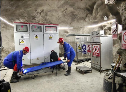 首先進行井下火災應急預案演練,此演練是模擬井下配電室起火,傷員在配電室中昏迷,需立即進行搶救工作。調度室接到報警后,立即通知受影響的其他作業人員撤離,并按照匯報程序及時通知帶班礦領導、礦長、相關科室及應急救援隊伍等人員。